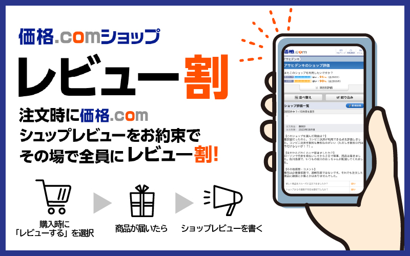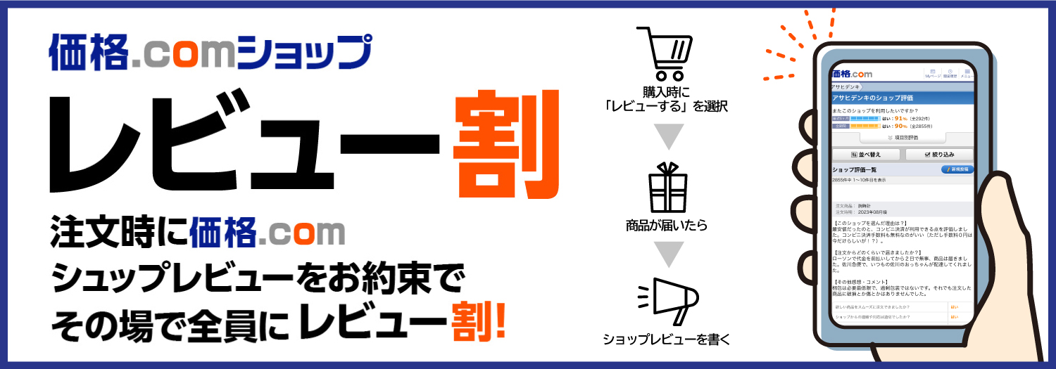 価格コム内のショップ評価を頂ける方は一部商品金額をキャッシュバック中