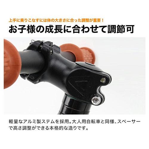 軽量なアルミ製ステムを採用。大人用自転車と同様、スペーサーで高さ調整ができる本格的な造りです。